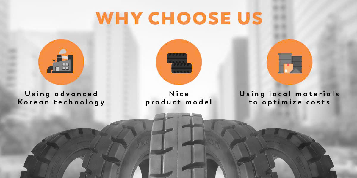 Công nghệ Hàn Quốc: Sản xuất trực tiếp trên dây chuyền hiện đại, đáp ứng các tiêu chuẩn khắt khe cho lốp xe nâng hàng và xe nâng người.